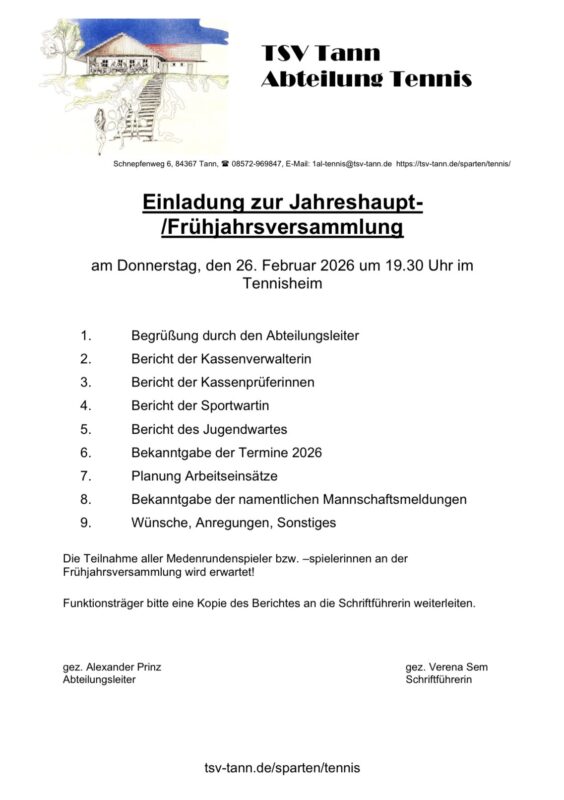Liebe Mitglieder der Abt. Tennis, die Jahreshauptversammlung steht vor der Tür. Siehe Anlage. Wir freuen uns über ein zahlreiches Erscheinen.