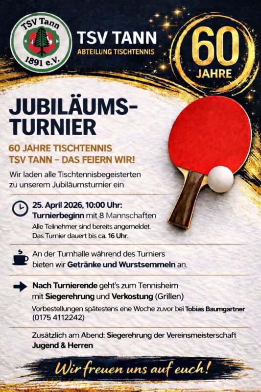Am 25.04.2026 feiert die Abteilung Tischtennis heuer ihr 60-jähriges Jubiläum. Beginnen wird der Tag mit einem Turnier in der Turnhalle in Tann mit befreundeten Vereinen aus umliegenden Orten. Danach feiern wir das Jubiläum gebührend im Tennisheim in Tann. In diesem Zuge findet auch die Siegerehrung der diesjährigen Vereinsmeisterschaft statt.